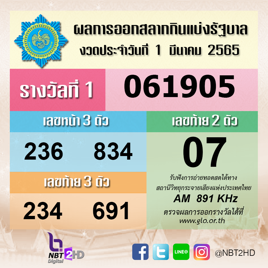 ตรวจหวย1มีนา2565! เลขหน้า 3 ตัว 2 รางวัลๆละ 4,000 บาท.